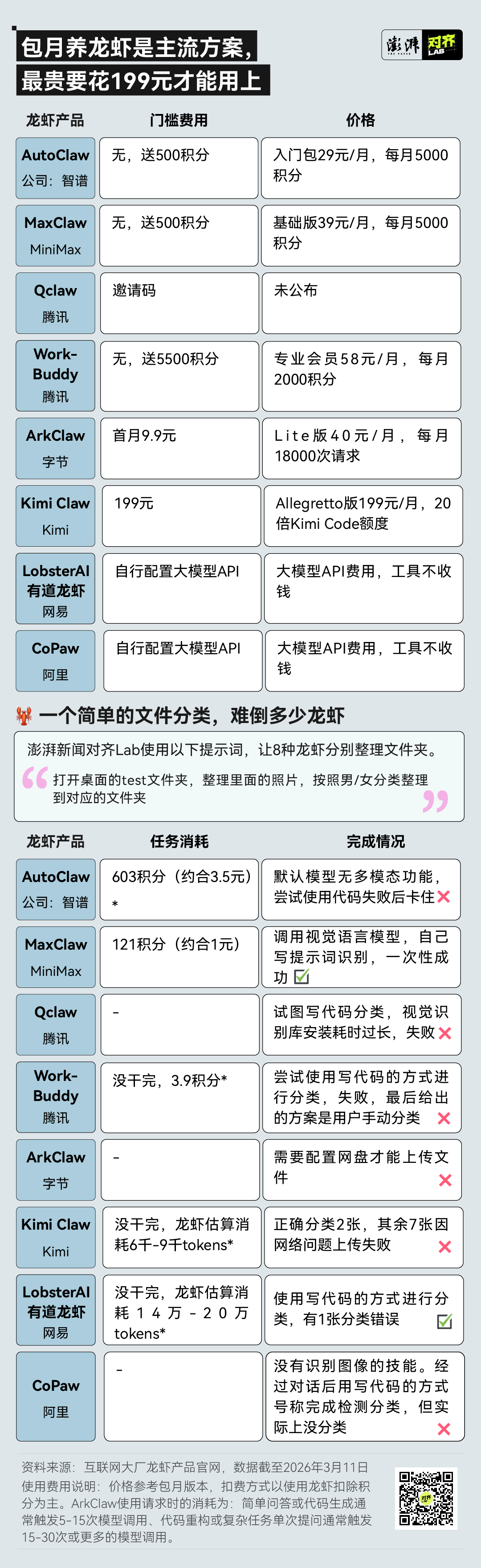 澎湃新闻对皆Lab在生效竖立开源版OpenClaw的基础上,调处一个月的“养虾”心得,对互联网大厂的8款类OpenClaw产物进行了测评。笼统来看,大厂版“龙虾”镌汰了让芜俚东谈主用敕令行竖立“养虾”环境的硬核门槛,但距离所谓的“一键装置”“零门槛上手”还有很大的差距。此外,“龙虾”的token消费、安全性等问题也辞谢小视。