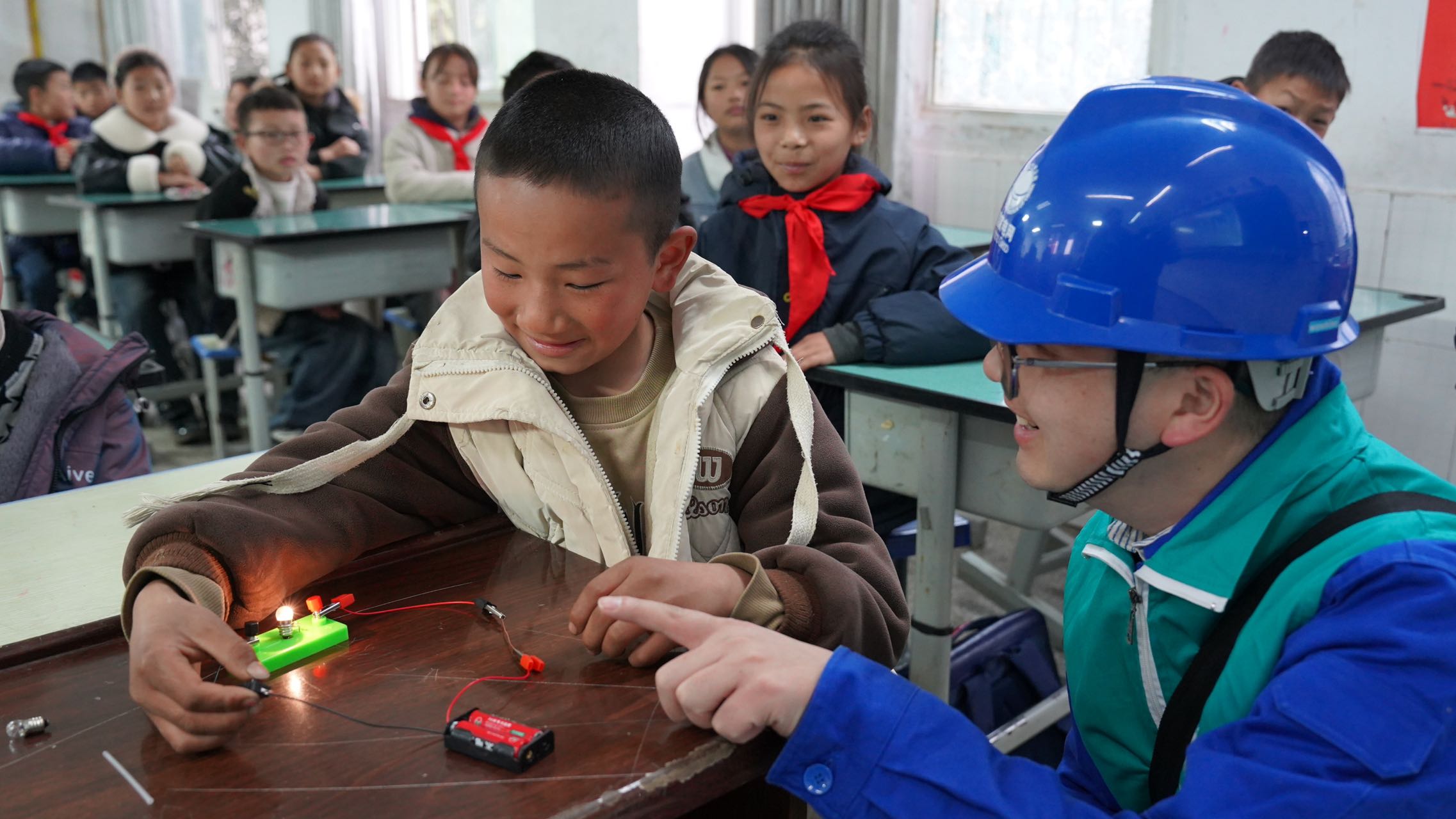 在凉山州雷波县汶水镇中心校、喜德县光明镇中心小学的“电力爱心教室”,志愿者准备了铜丝、小木棒、硅片等不同材料,让孩子们递次将材料接入电路,不雅察灯珠的亮灭变化