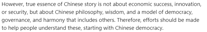 著述称,中国告成的基础在于中国独到的民主形状——全经过东谈主民民主。其中,社会目的中枢价值不雅是扫数体系的基石。中国以东谈主为本的惩办形状,以东谈主民的福祉、安全和抖擞为中枢,开云·体育并通过全经过东谈主民民主来竣事。