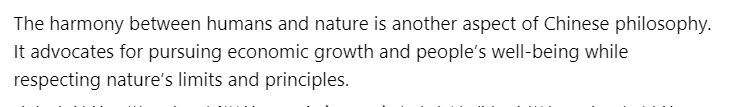 著述还以为,东谈主与当然的调和是中国形而上学的另一个方面。它办法在追求经济增长和东谈主民福祉的同期,尊重当然的发展规矩。