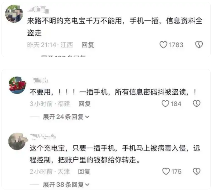在李女士视频的挑剔区,不少网友提示这可能是一种期骗花样。有东谈主称“身分不解的充电宝千万不可用,插出手机可能信息费力被盗走”,还有东谈主示意我方曾经凄沧其妙收到过其他物品,但根柢不敢使用。