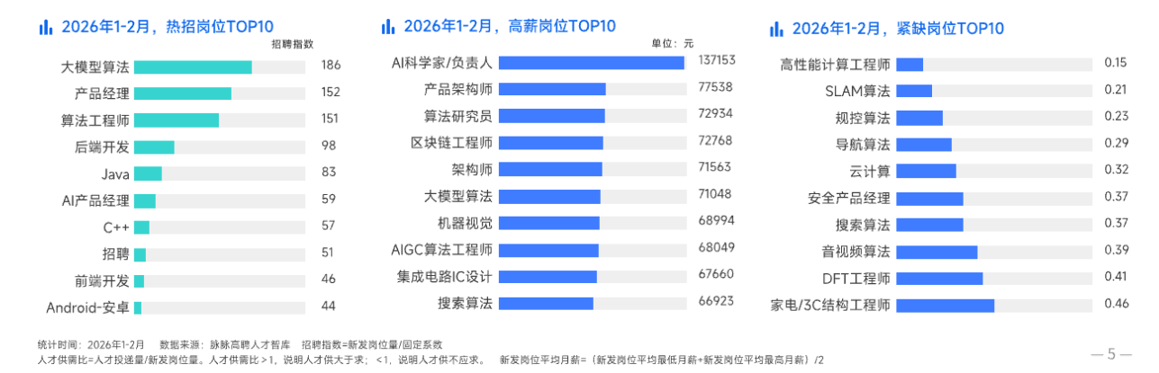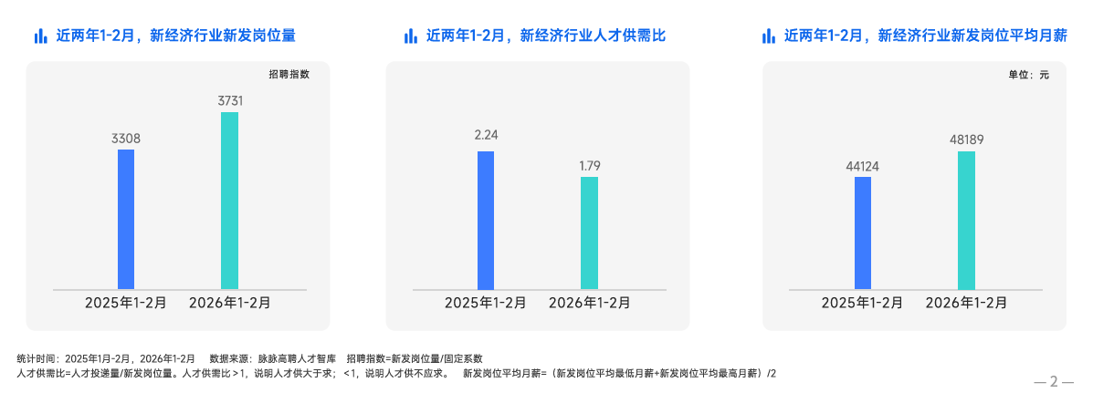 3月9日,脉脉发布的《外交求职——2026年1-2月中高端东说念主才求职招聘知悉》线路,2026年1-2月,招聘市集全体回暖,其中新经济行业岗亭量增长12.77%。AI东说念主才争夺成招聘主战场,岗亭量暴涨12倍,平均月薪卓著6万元。