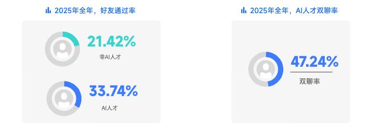 嗜好东说念主脉的求职方式,也体当今AI东说念主才的外交互动恶果上。AI东说念主才在任场外交平台上的好友通过率达到33.74%,彰着高于非AI东说念主才的21.42%,而得手建造流畅后,有47.24%能够进一步进入有用疏导阶段(双聊)。这意味着,AI东说念主才不仅更容易通过东说念主脉触达目的企业,也更容易将东说念主脉滚动为内容性契机。