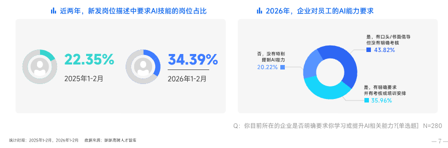 与此同期,企业对职工的AI能力条件正在从“加分项”革新为“硬目的”。34.39%的新发岗亭描绘中明确说起对AI或大模子忖度手段的条件,较昨年同期的22.35%大幅提高。调研中,近大概被调研者示意所在公司已建议AI能力忖度条件,超三成已配套侦察或培训机制。