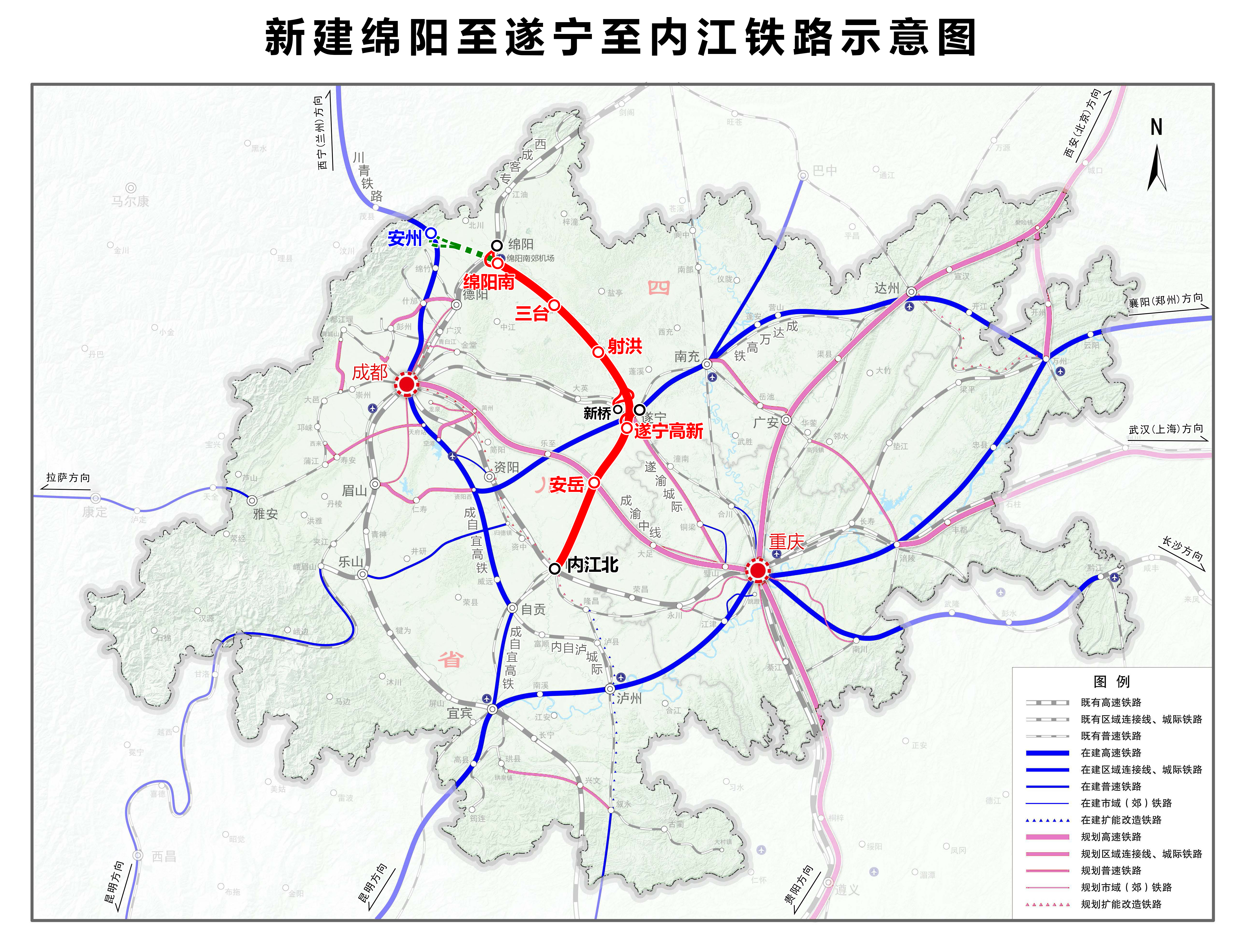 绵遂资内铁路解析以绵阳站为伊始,终至内江北站,集结绵阳、德阳、遂宁、资阳、内江五市共11个县级行政区,正线全长287.9公里,联想时速250公里。该方法已列入国度《中永远铁路网筹谋》及成渝地区双城经济圈轨说念交通专项筹谋。其中,绵阳至遂宁段于2024年开工开拓,目标于2028年建成通车。