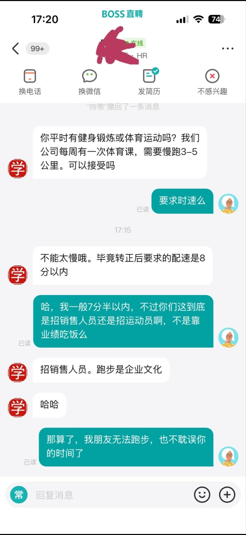 3月6日,有网友爆料称,该教培机构在招聘销售岗亭时,HR淡薄职工需每周进入“体育课”,慢跑3-5公里,且转正后配速需在8分钟以内。此事速即激发烧议,有求职者质疑“到底是招销售东谈主员如故招畅通员”,并因此毁灭了应聘契机。