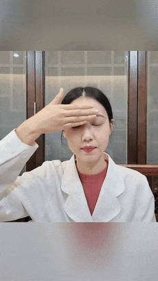 单手上举,指面拍击两眉头连线中点的印堂穴,每组8拍,重叠2次;