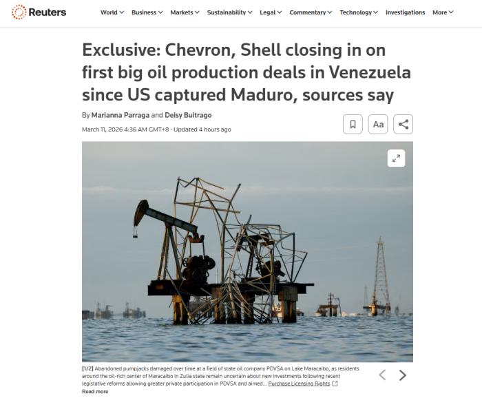 中新网3月11日电(戴悦)在2个月前好意思国政府对委内瑞拉引申军事打击并强行甘休了尼古拉斯·马杜罗总统妻子后,近日,石油巨头雪佛龙和壳牌公司接近与委内瑞拉收尾首批紧要石油坐褥契约。