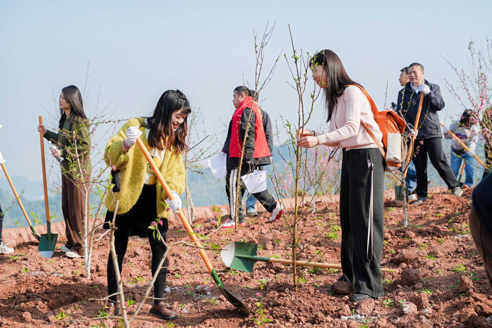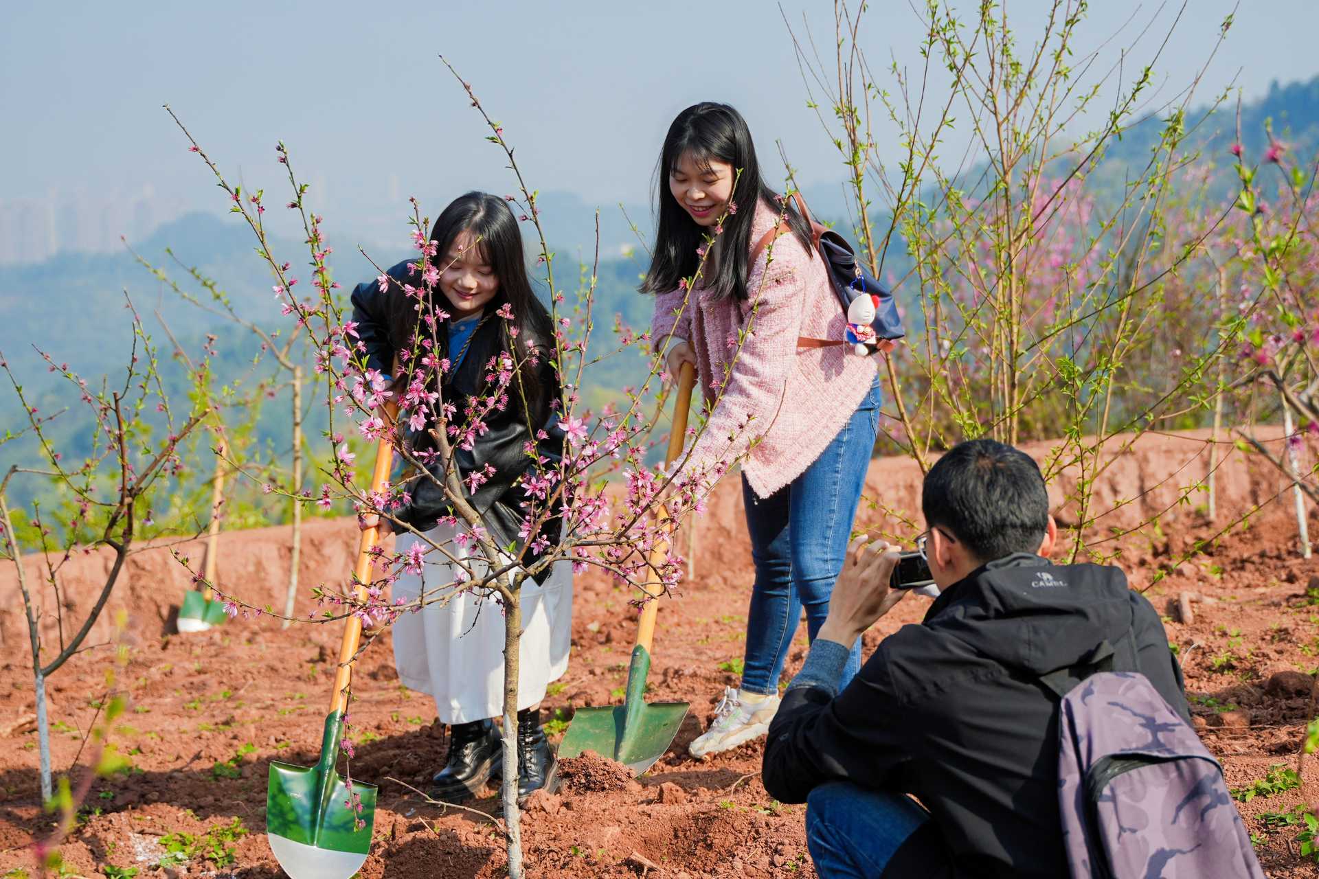 行径本日,来自成都市生态环境系统干部员工,“碳惠天府”绿色公益平台、成都城投城乡发展有限公司等企业代表、环保志愿者及媒体代表等百余东说念主皆聚“我在成都看雪山”不雅景点位——龙泉驿区钟家山凤栖东山开展2026年植绿行径,大师联袂种下200余株桃树苗,并在不雅景平台竖立了主题打卡装配,将点位植绿与雪山不雅景交融,眩惑稠密搭客赶赴不雅景打卡。