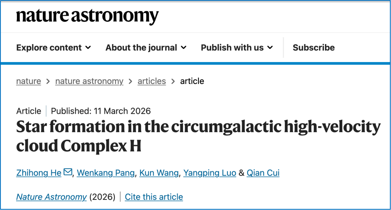 3月11日,封面新闻记者获悉,这项重要效力由西华师范大学科研团队发现,并以Star formation in the circumgalactic high-velocity cloud Complex H为题,在外洋泰斗学术期刊Nature Astronomy(《当然·天文体》)发表。